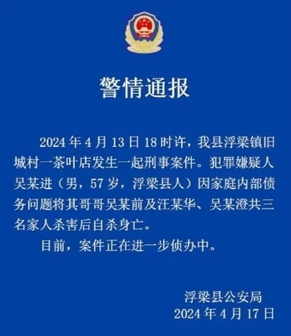 ·警方通報“知名茶企老板一家三口遇害案”:犯罪嫌疑人因家庭內(nèi)部債務問題將其哥哥吳某前等三名家人殺害后自殺身亡。