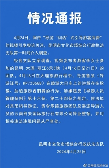 ·云南一導(dǎo)游“訓(xùn)話”式引導(dǎo)游客消費(fèi)?當(dāng)?shù)赝▓?bào):擬吊銷導(dǎo)游證。