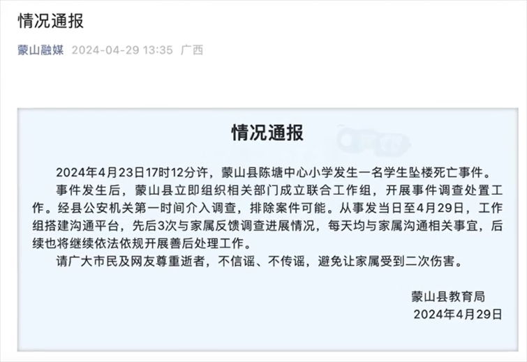 ·廣西蒙山一小學生墜樓死亡,公安機關排除案件可能。