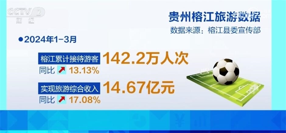 在“村超”流量的帶動(dòng)下,2024年1—3月榕江累計(jì)接待游客142.2萬(wàn)人次,同比增長(zhǎng)13.13%,實(shí)現(xiàn)旅游綜合收入14.67億元,同比增長(zhǎng)17.08%。