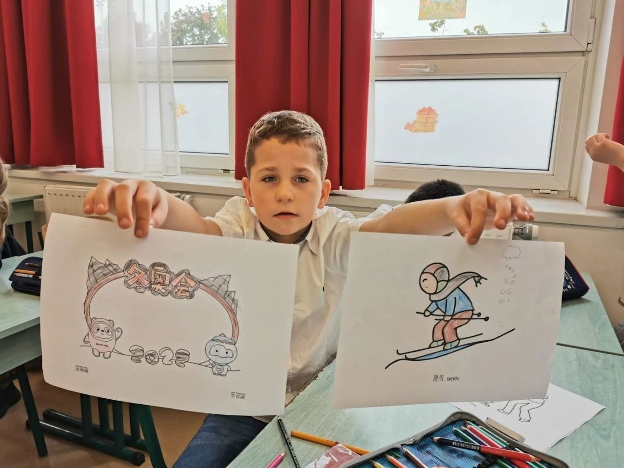 △匈中雙語學(xué)校學(xué)生展示具有冬奧元素的填圖畫 。