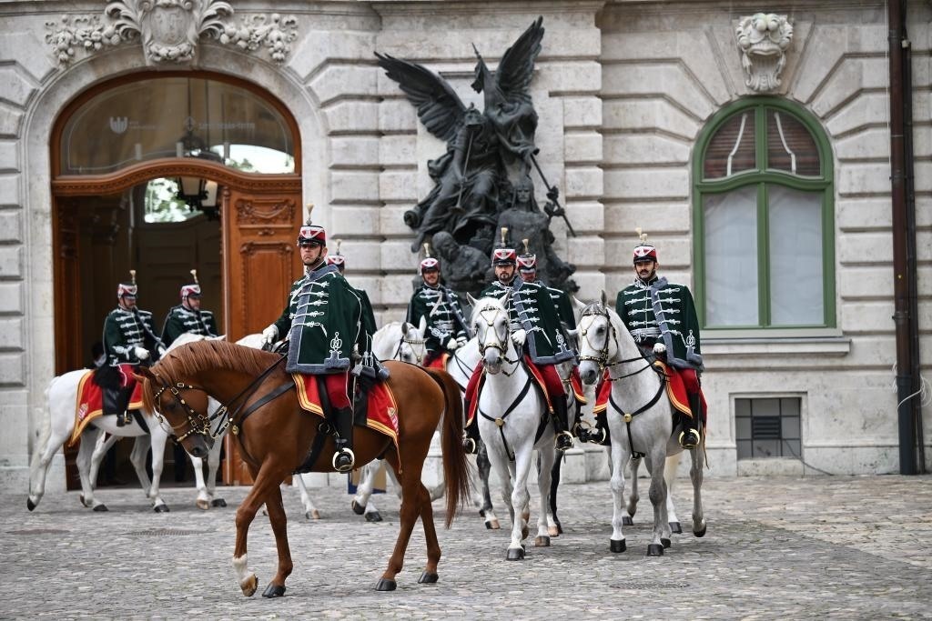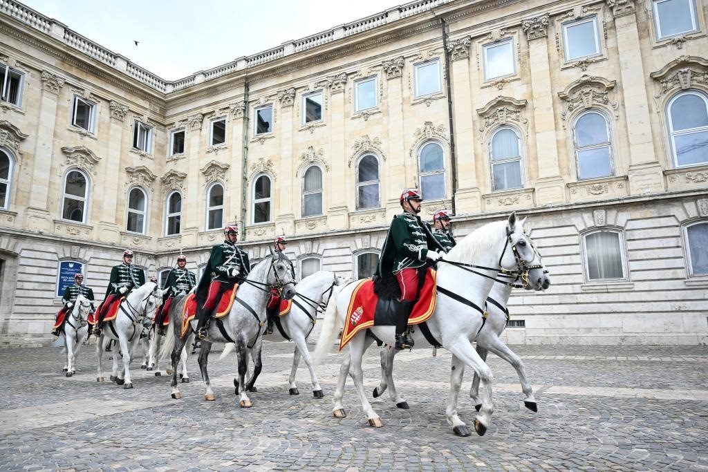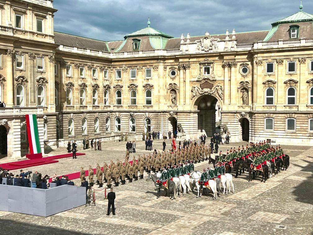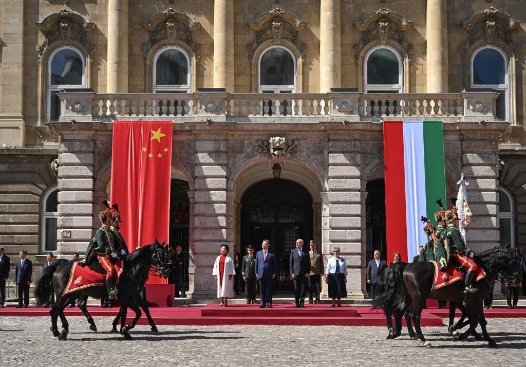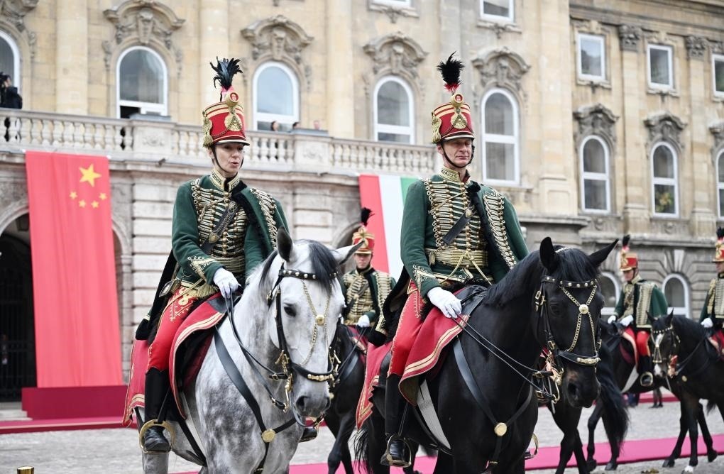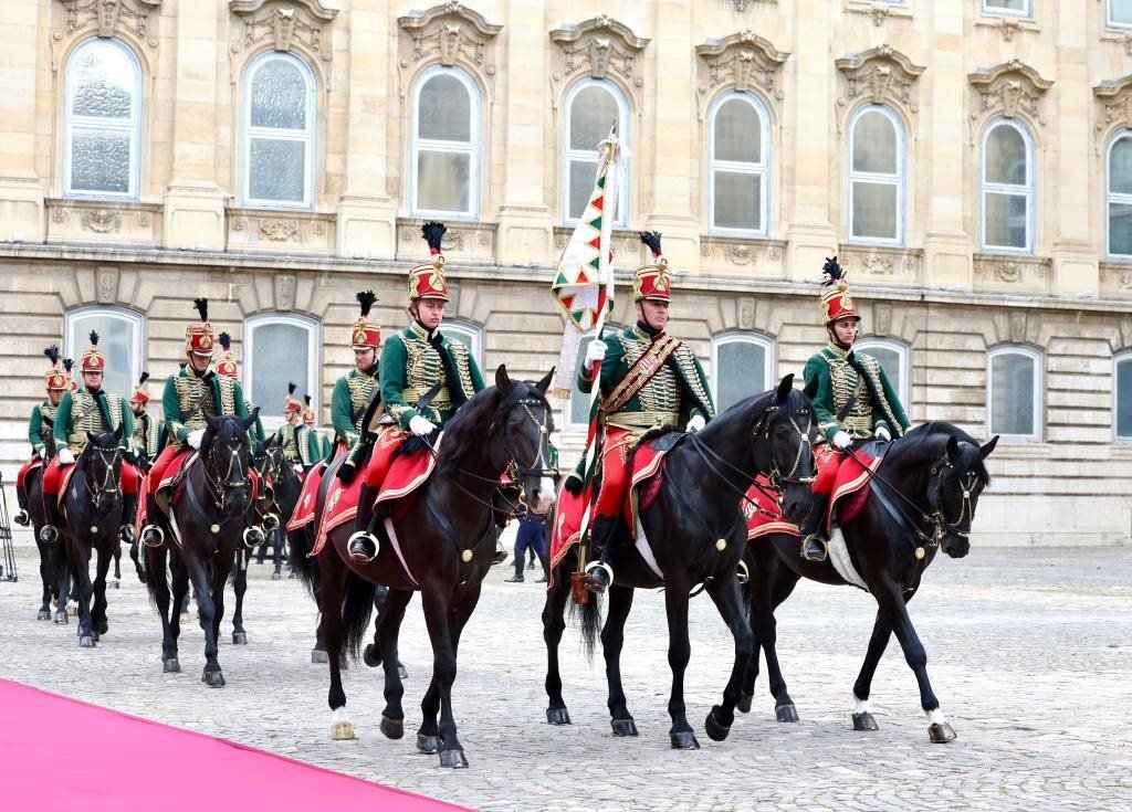 初夏時節(jié)的布達佩斯陽光明媚,古老宏偉的布達王宮莊嚴矗立,中匈兩國國旗相映成輝。習近平和夫人彭麗媛乘坐的國賓車隊在匈牙利禮賓馬隊護衛(wèi)下緩緩駛?cè)氩歼_王宮內(nèi)庭。舒尤克總統(tǒng)夫婦和歐爾班總理夫婦熱情迎接。