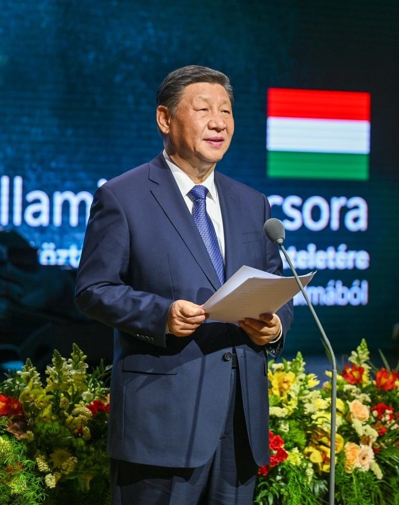 當?shù)貢r間5月9日晚,國家主席習近平和夫人彭麗媛在布達佩斯城堡山出席匈牙利總理歐爾班和夫人雷沃伊舉行的隆重歡迎宴會。這是習近平在宴會上致辭。