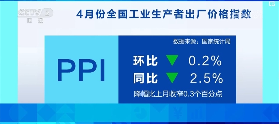 4月份,工業(yè)生產(chǎn)繼續(xù)恢復(fù),全國工業(yè)生產(chǎn)者出廠價格指數(shù)PPI環(huán)比下降0.2%,同比下降2.5%,降幅比上月收窄0.3個百分點。