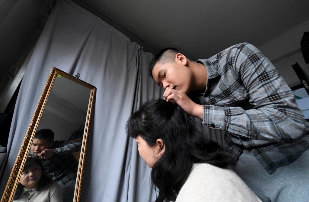 ?↑在位于廣西南寧市北湖北路的出租房里,陽陽幫媽媽何冬艷拔白頭發(fā)(2023年3月31日攝)。