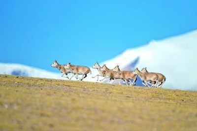 在羌塘國家級自然保護區(qū),一群雌性藏羚羊在奔跑。 新華社發(fā)