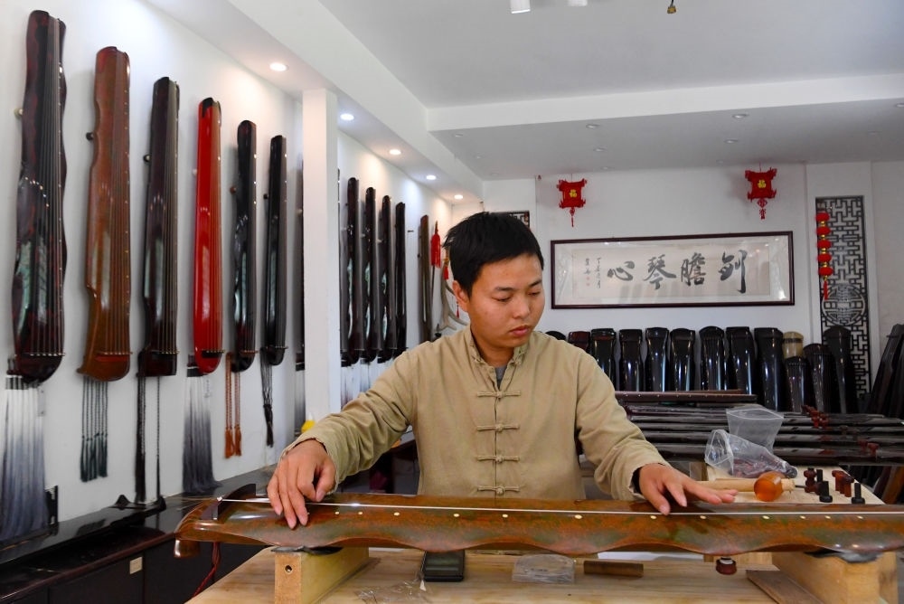 在堌陽鎮(zhèn)徐場村,沿街宅院里傳出打磨木材和動聽的琴瑟之聲。尋聲踏入小院,“90后”琴師徐亞沖正撥動琴弦,調(diào)試古琴?!爸魄俨粌H是我們致富的門路,彈琴已成為我們的新生活方式?!?/p>
