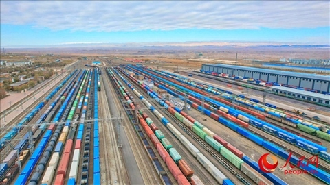 阿拉山口站編組場(chǎng)內(nèi)??恐l(fā)的中歐班列及其他出入境貨物列車(chē)。人民網(wǎng) 李欣洋攝