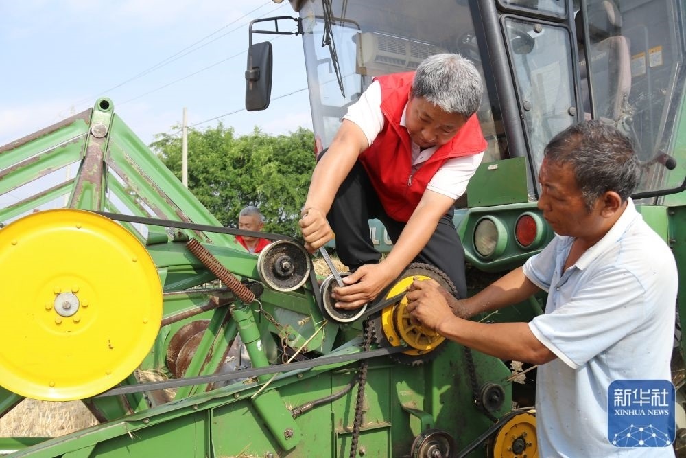 5月26日,在河南省南陽市內(nèi)鄉(xiāng)縣大橋鄉(xiāng),農(nóng)機服務(wù)人員(右二)為跨區(qū)作業(yè)的農(nóng)機手提供免費機修服務(wù)。新華社發(fā)(張中立攝)