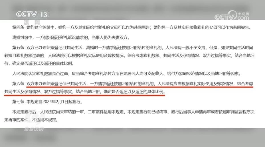陜西省韓城市人民法院芝陽人民法庭庭長王春妮:“我們跟原告充分釋法明理,讓他知道咱們國家有新的規(guī)定,對他經(jīng)過反復做工作,他也降低了自己的心理預(yù)期。被告這邊認為我跟你在一起共同生活了,我也是實心想跟你過日子,但是因為沒有領(lǐng)證,而且我還跟你共同生育了一個孩子,你現(xiàn)在要求我給你返還彩禮,我就不愿意返還,心里有抵抗情緒?!?/p>
