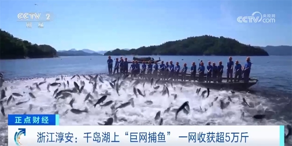 浙江淳安:千島湖上“巨網(wǎng)捕魚” 一網(wǎng)收獲超5萬(wàn)斤