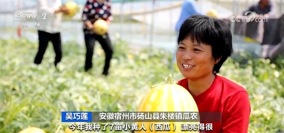 安徽碭山縣朱樓鎮(zhèn)瓜農(nóng)吳巧蓮介紹:“今年我種了7畝小黃人西瓜,漂亮得很,產(chǎn)量在8000斤左右,價(jià)格每斤3元左右,比普通的瓜一斤貴一元多。這個(gè)瓜賣30多元一個(gè)。”