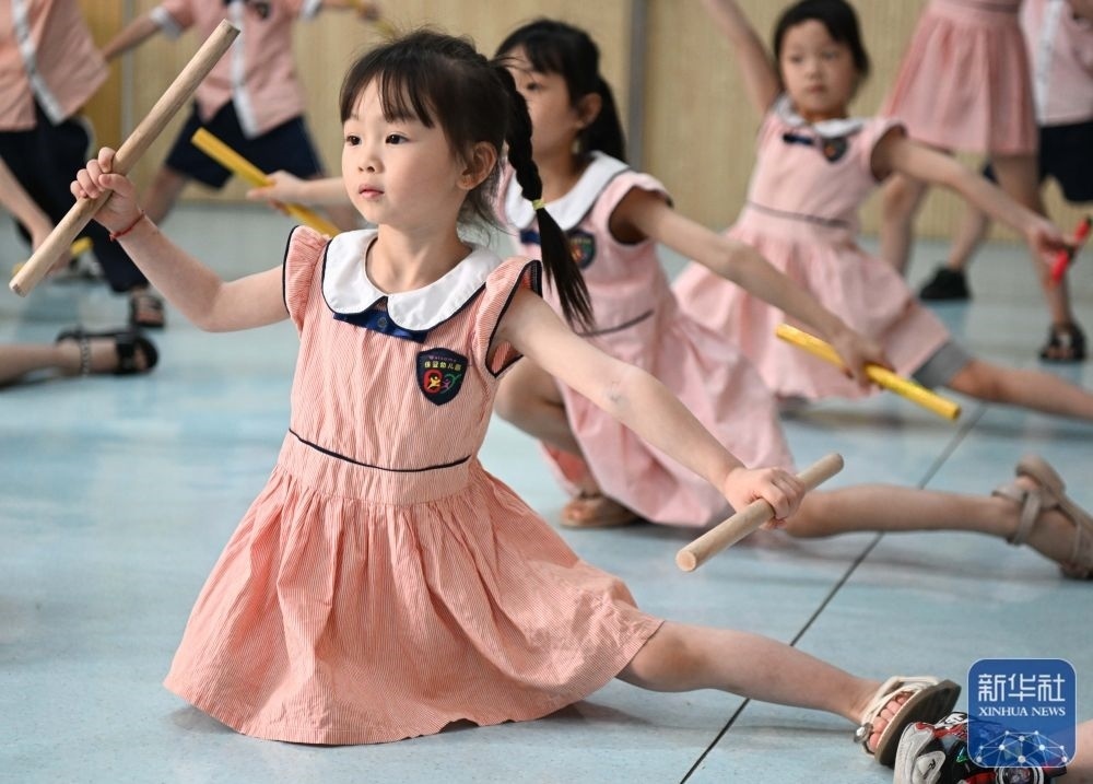 5月29日,在汕頭市貴嶼鎮(zhèn)北林保嬰幼兒園,莊恩琪(前左)在練習跳英歌舞。