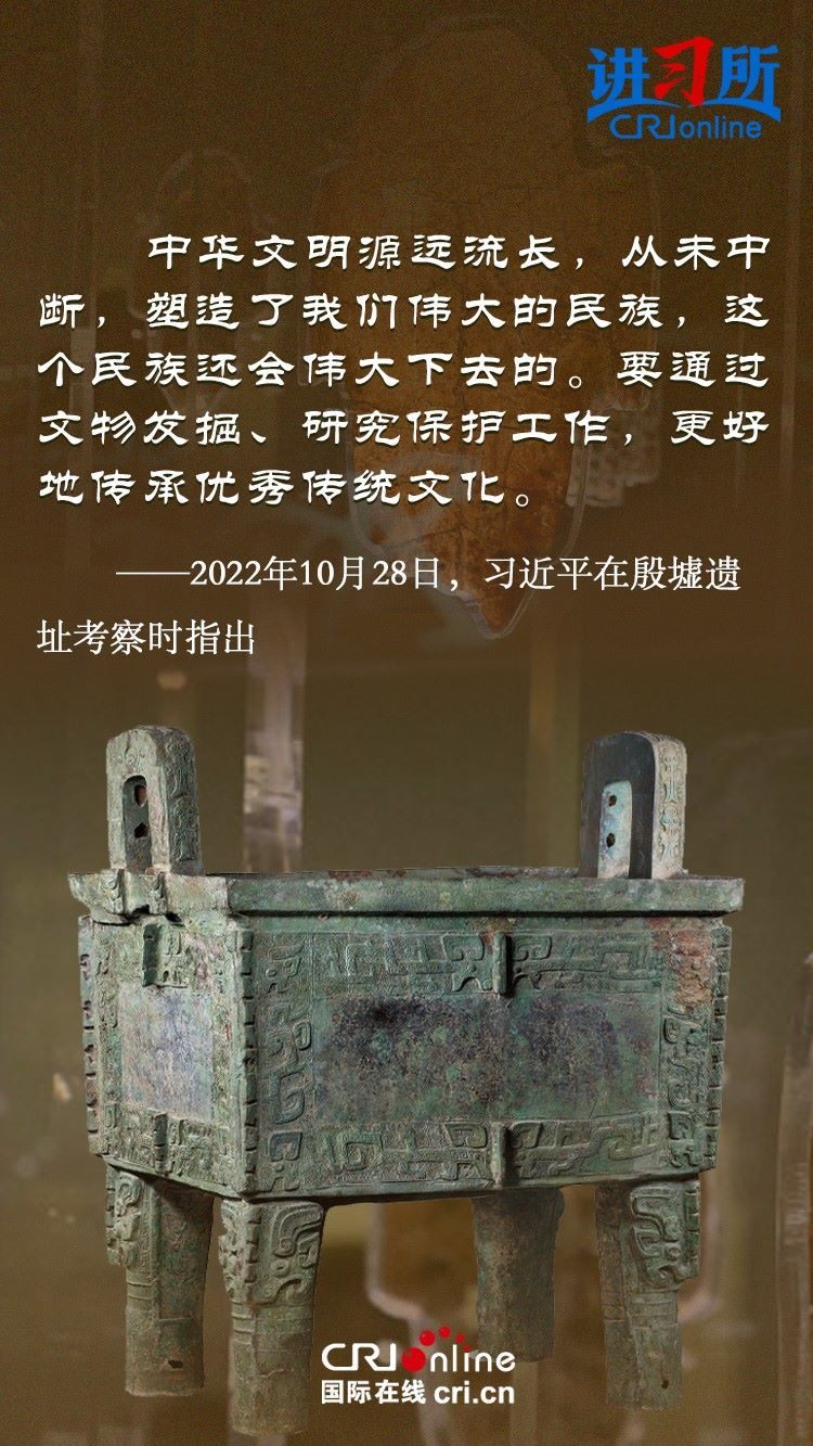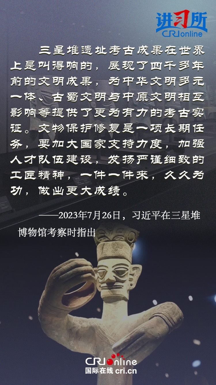 文物和文化遺產(chǎn)承載燦爛文明,傳承歷史文化,維系民族精神。三星堆博物館、殷墟遺址、敦煌研究院……這些年,習(xí)近平高度重視中華文明探源工程和文物保護(hù)工作,強調(diào)要把中華文明歷史引向深入,把中華優(yōu)秀傳統(tǒng)文化一代一代傳下去。