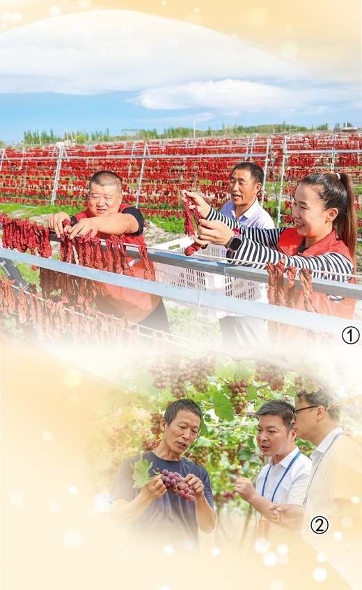 圖①:新疆維吾爾自治區(qū)博湖縣塔溫覺(jué)肯鄉(xiāng)辣椒曬場(chǎng)上,黨員志愿服務(wù)隊(duì)幫助村民晾曬辣椒。年 磊攝 圖②:浙江省淳安縣紀(jì)檢監(jiān)察干部走訪果農(nóng),聽(tīng)取意見(jiàn)建議。謝航凱攝