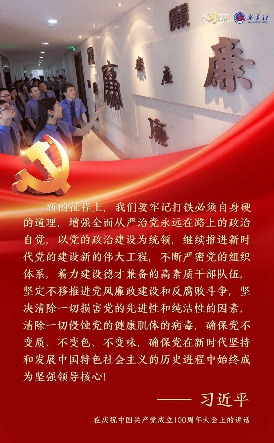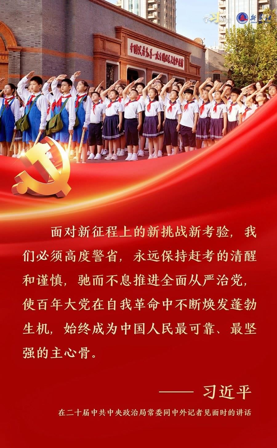 習(xí)近平總書(shū)記強(qiáng)調(diào),面對(duì)新征程上的新挑戰(zhàn)新考驗(yàn),我們必須高度警省,永遠(yuǎn)保持趕考的清醒和謹(jǐn)慎,馳而不息推進(jìn)全面從嚴(yán)治黨,使百年大黨在自我革命中不斷煥發(fā)蓬勃生機(jī),始終成為中國(guó)人民最可靠、最堅(jiān)強(qiáng)的主心骨。