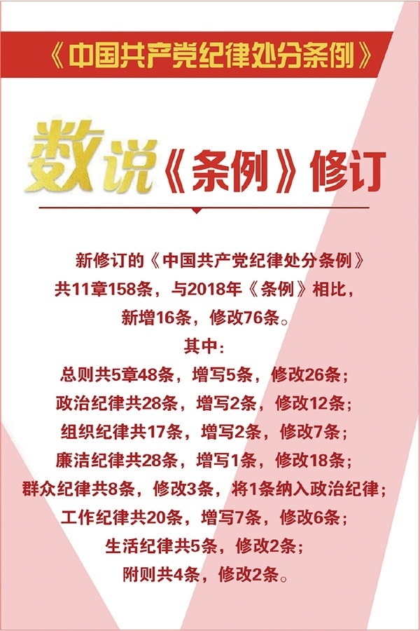 2023年新修訂的《中國共產(chǎn)黨紀(jì)律處分條例》,與時俱進(jìn)完善紀(jì)律規(guī)范,與2018年《條例》相比,新增16條,修改76條,進(jìn)一步扎緊織密制度籠子。