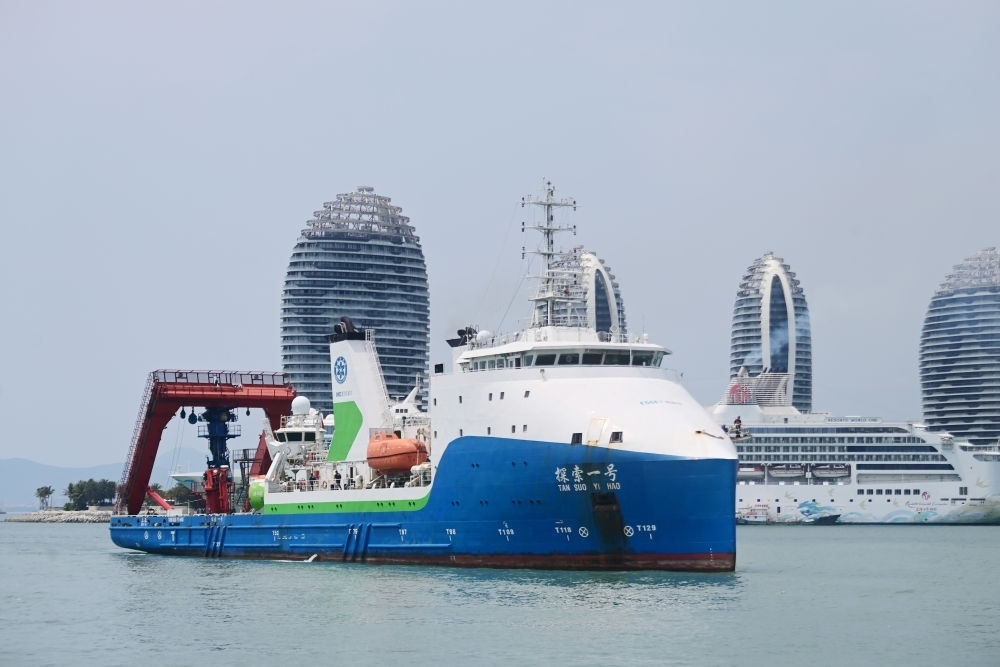 “探索一號”科考船搭載“奮斗者”號全海深載人潛水器返回海南三亞(2024年3月28日攝)。此次科考歷時50天,順利完成中國-印度尼西亞爪哇海溝聯(lián)合深潛任務(wù)。新華社發(fā)(沙曉峰 攝)