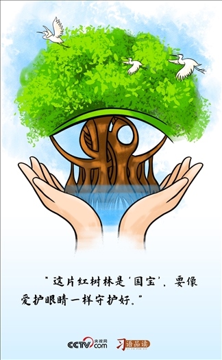 “國寶”一詞強調(diào)了紅樹林不可估量的價值,及其在國家發(fā)展中的重要地位?!跋駩圩o眼睛一樣守護好”,則重申了保護紅樹林的緊迫性和重要性。
