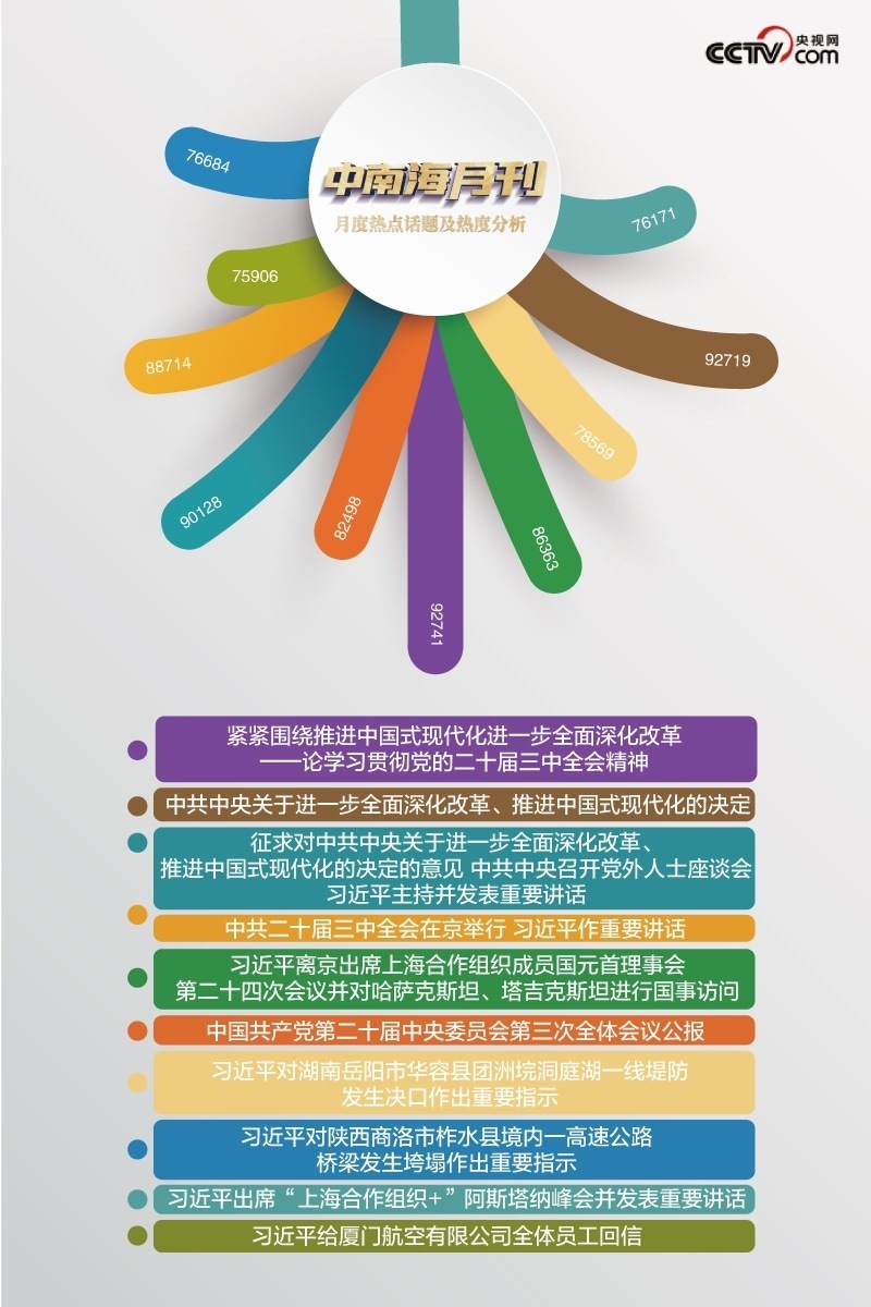 央視網(wǎng)“智聞”系統(tǒng)提取分析2024年7月全網(wǎng)時(shí)政新聞熱點(diǎn)顯示,本月“中共中央關(guān)于進(jìn)一步全面深化改革、推進(jìn)中國式現(xiàn)代化的決定”“中共二十屆三中全會(huì)在京舉行 習(xí)近平作重要講話”等話題備受關(guān)注。