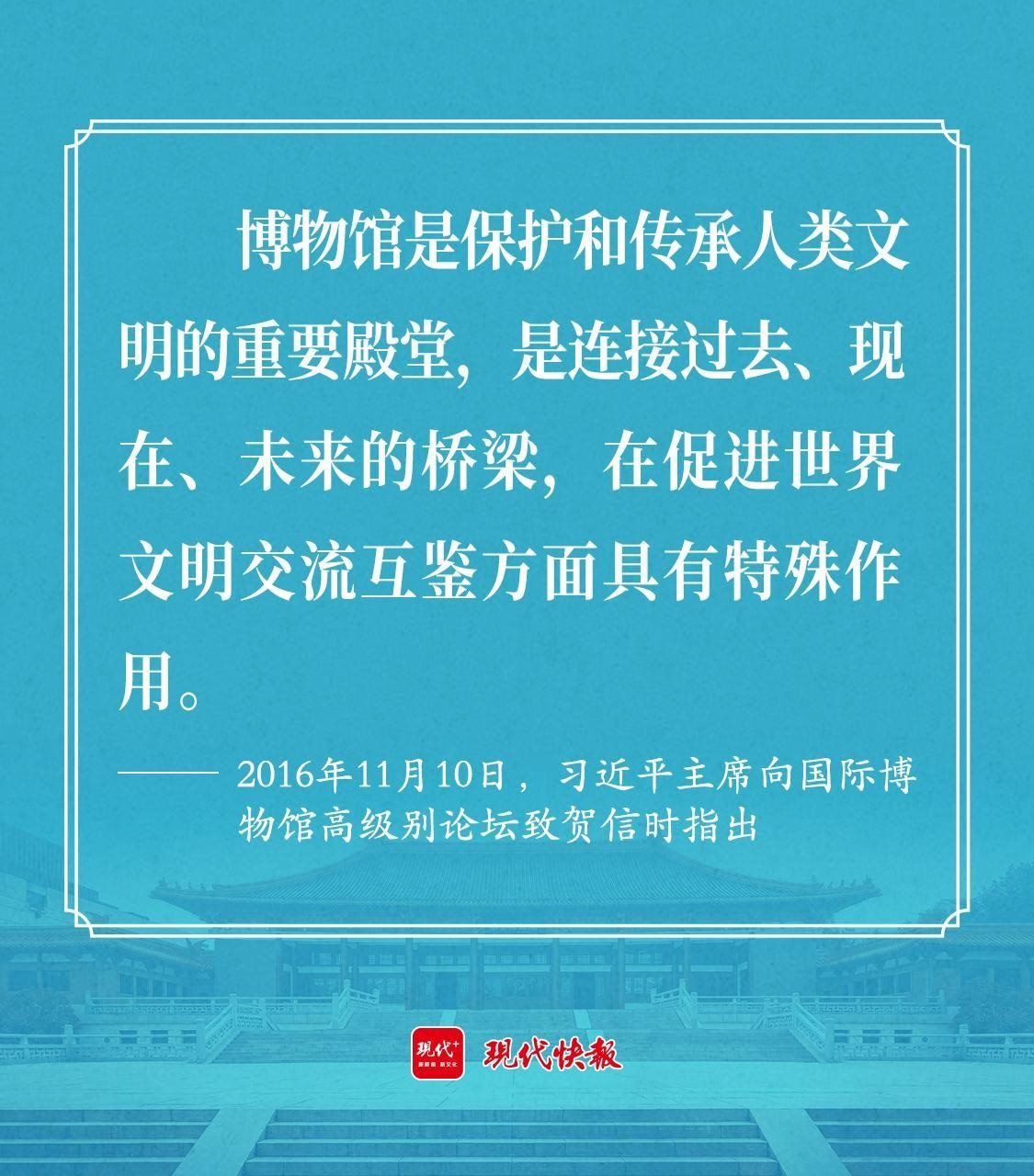 2016年11月10日,習(xí)近平主席向國際博物館高級別論壇致賀信時指出,博物館是保護和傳承人類文明的重要殿堂,是連接過去、現(xiàn)在、未來的橋梁,在促進世界文明交流互鑒方面具有特殊作用。