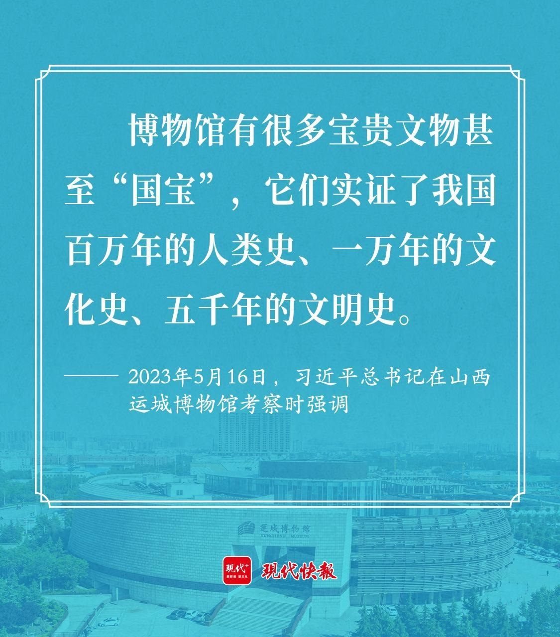 2023年5月16日,習(xí)近平總書記考察山西運城博物館時強調(diào),博物館有很多寶貴文物甚至“國寶”,它們實證了我國百萬年的人類史、一萬年的文化史、五千年的文明史。