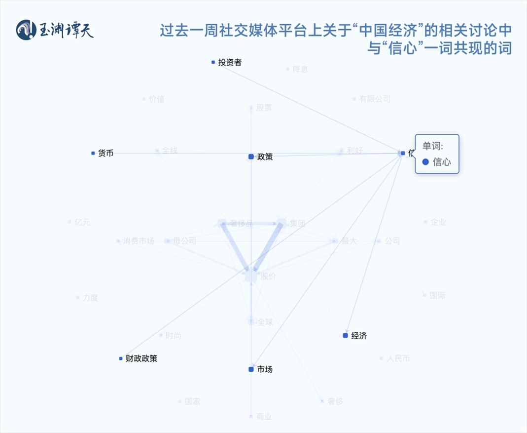 其中,跟“信心”一詞共現(xiàn)最多的一組詞是“政策、貨幣、投資者、市場(chǎng)、財(cái)政政策”