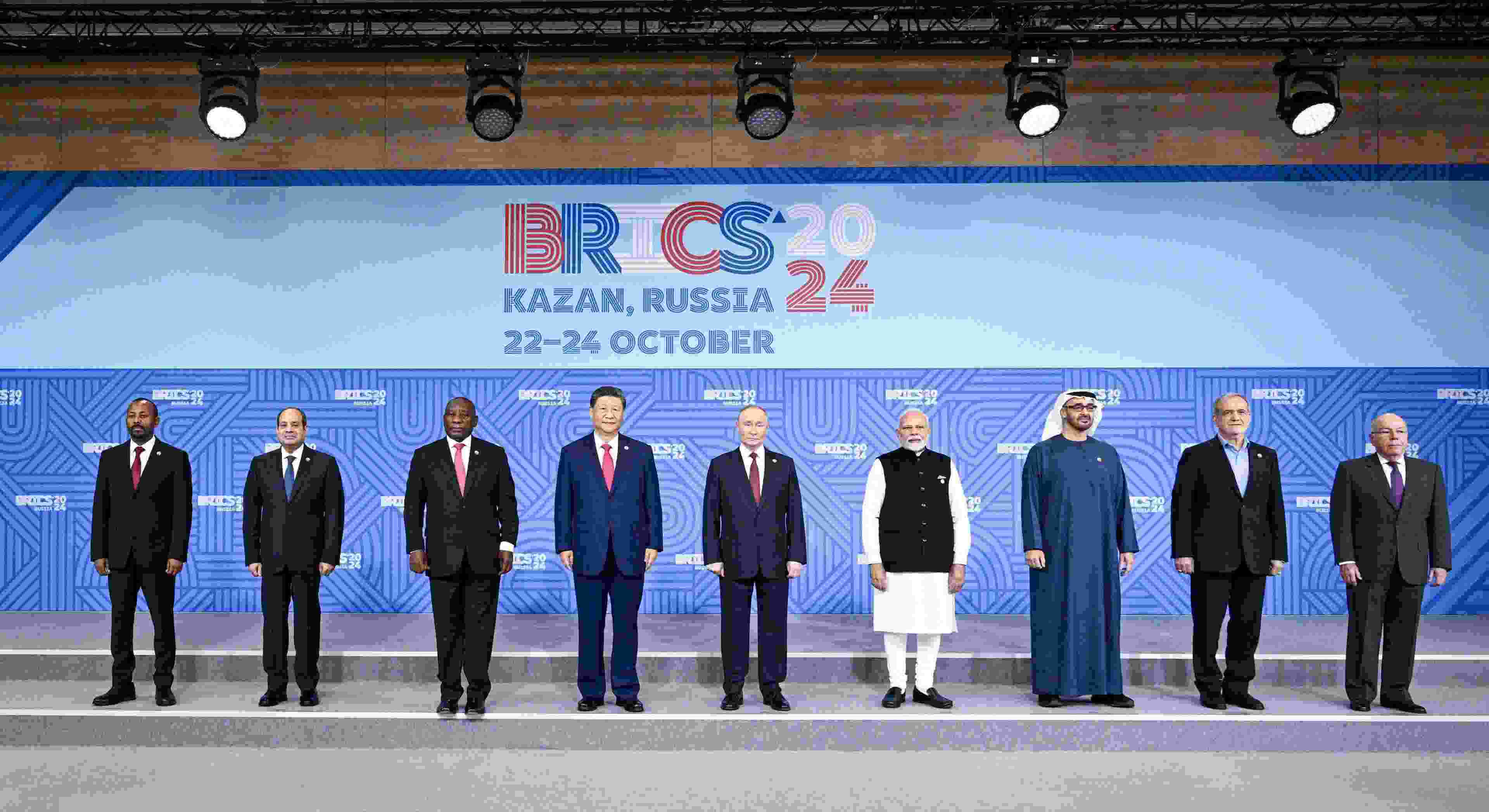 △當?shù)貢r間2024年10月24日上午,國家主席習(xí)近平在喀山會展中心出席金磚成員國、嘉賓國領(lǐng)導(dǎo)人和國際組織負責(zé)人集體合影。