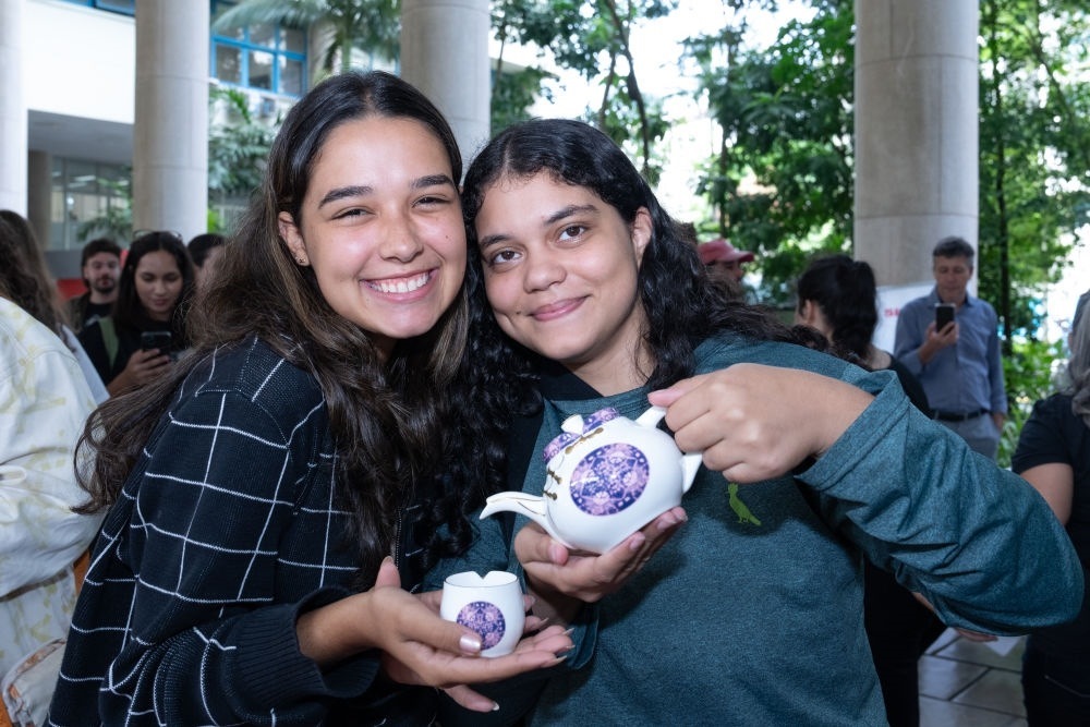 2024年4月18日,在巴西里約熱內(nèi)盧舉行的聯(lián)合國中文日活動上,巴西學生手持中國工藝品合影。
