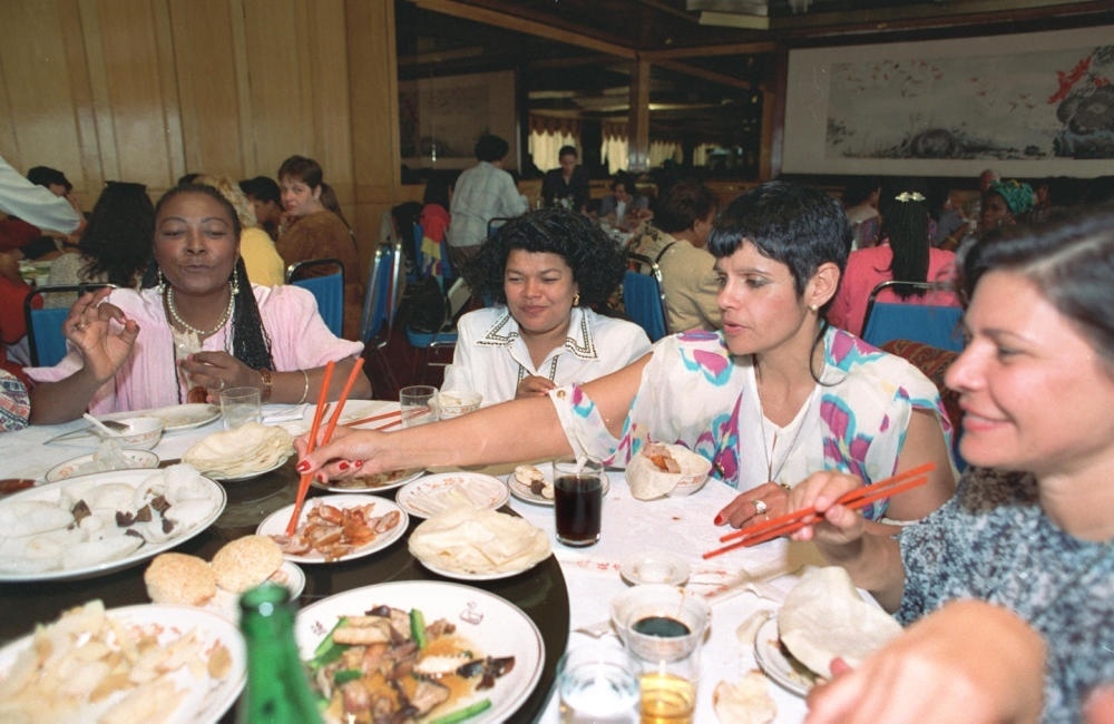 1995年9月10日,來華參加世界婦女大會的巴西代表結伴來到北京和平門全聚德烤鴨店,品嘗北京烤鴨。
