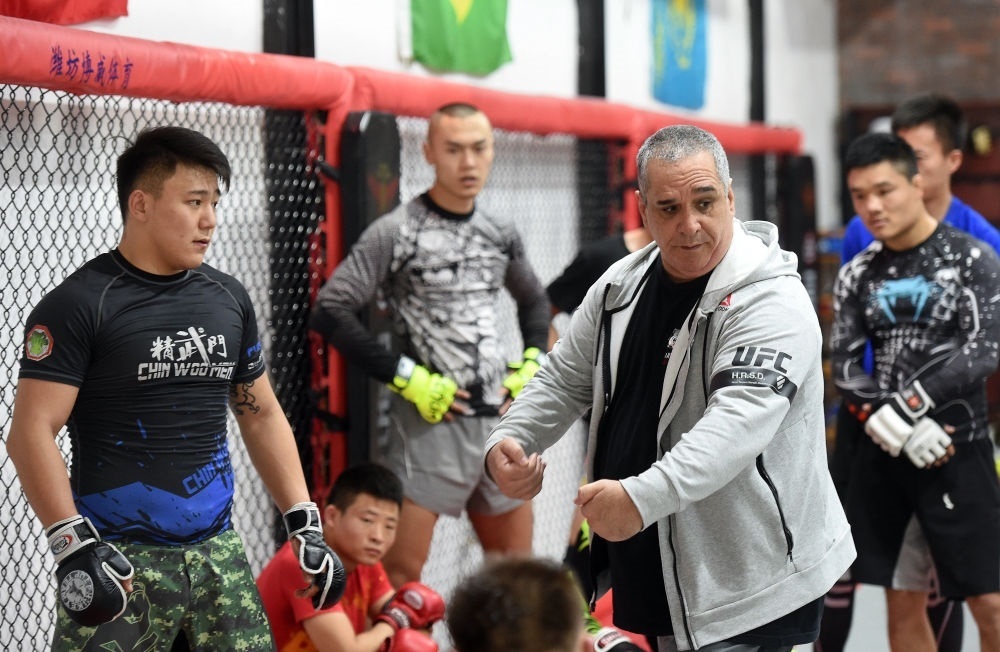2019年11月6日,來自巴西里約熱內(nèi)盧的柔術教練魯伊·梅內(nèi)賽斯在北京一家搏擊館講解動作要領。