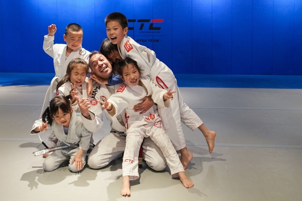 2023年4月7日,在北京一家格斗館內(nèi),巴西柔術教練席爾瓦(中)在一堂柔術課結束后與學生們合影留念。為了更好地了解中國和傳統(tǒng)武術,席爾瓦于2016年來到北京,在一家格斗館擔任巴西柔術教練。
