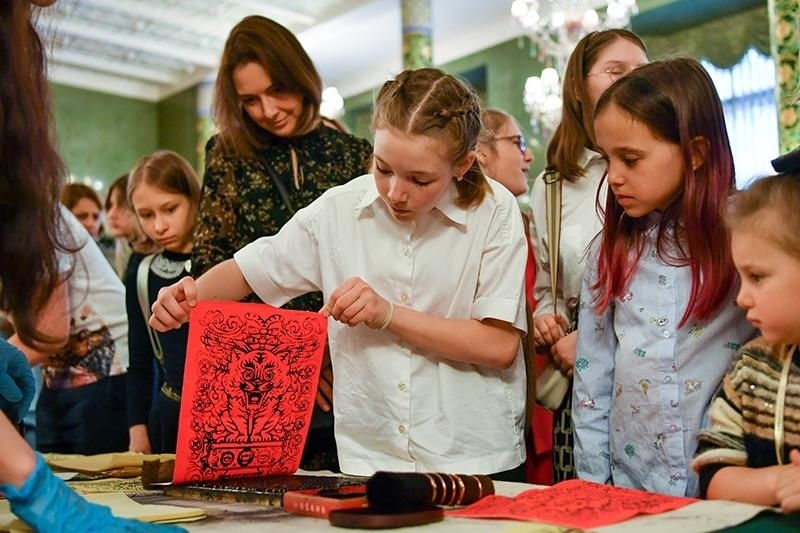 2023年6月2日,在位于俄羅斯莫斯科的中國駐俄羅斯大使館舉行的一場中國傳統(tǒng)文化體驗活動上,一名小朋友體驗雕版印刷。