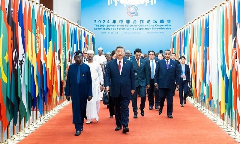 2024年9月5日,習近平主席在北京人民大會堂出席中非合作論壇北京峰會開幕式并發(fā)表主旨講話。這是習主席同外方領導人共同步入會場。