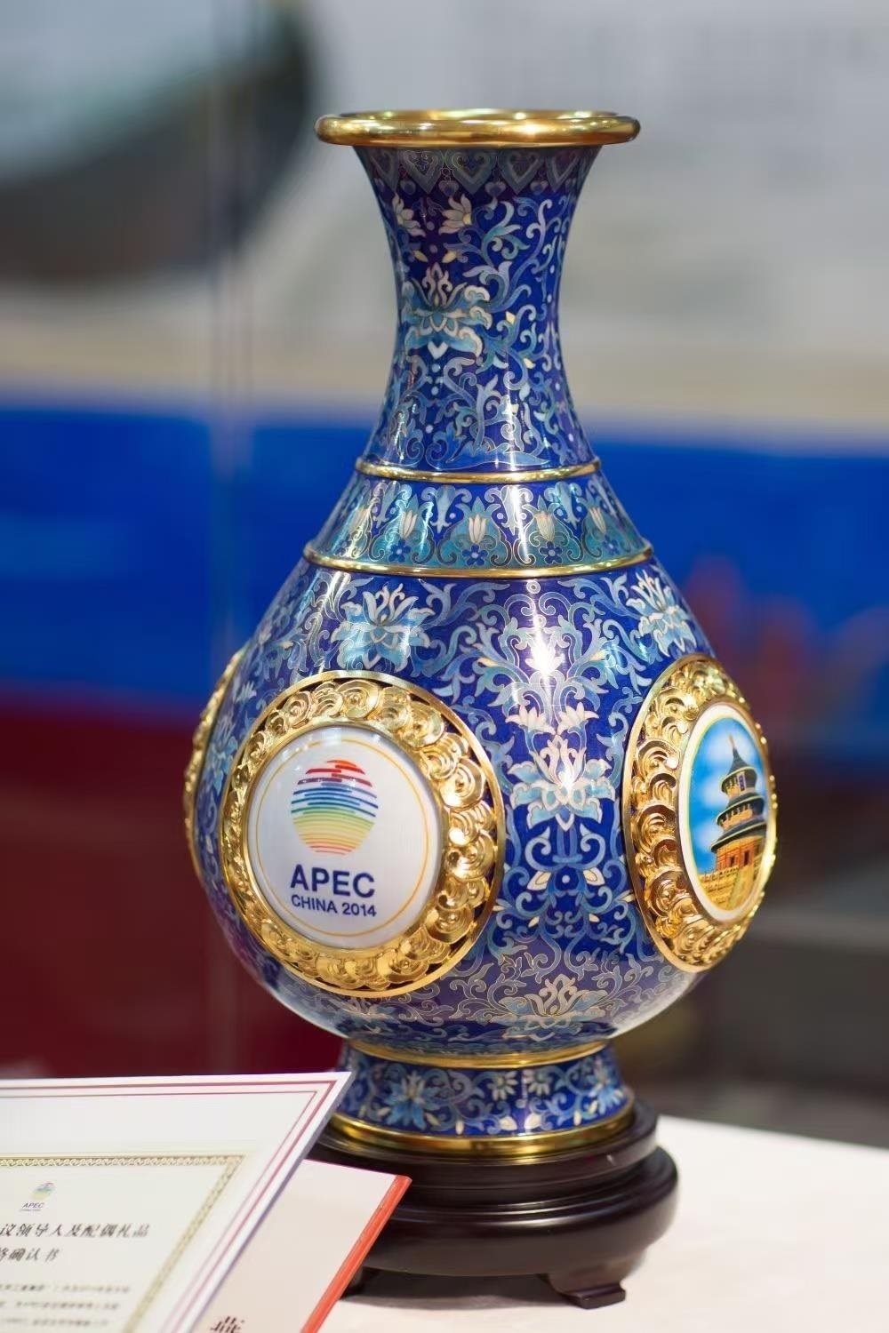 2014年11月,北京APEC會議在雁棲湖畔舉行。為歡迎參會的各經(jīng)濟(jì)體領(lǐng)導(dǎo)人,習(xí)近平主席選定了一件國禮——“四海升平”景泰藍(lán)賞瓶。賞瓶的細(xì)節(jié)蘊含巧思:瓶高38厘米,是天壇祈年殿38米的等比例縮??;最大直徑21厘米,代表APEC的21個經(jīng)濟(jì)體。碧藍(lán)的瓶身雕著水紋,既象征“四海”也代表環(huán)太平洋?!捌俊笔恰捌健钡闹C音,連起來即“四海升平”。
