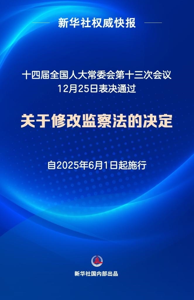 12月25日,十四屆全國(guó)人大常委會(huì)第十三次會(huì)議表決通過(guò)關(guān)于修改監(jiān)察法的決定,自2025年6月1日起施行。