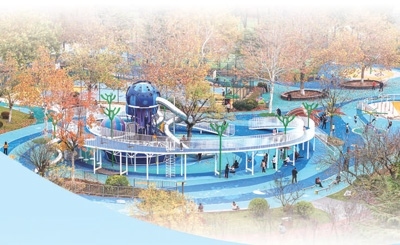 山東榮成市桑干河植物園內一處“口袋公園”,市民在游玩、健身。