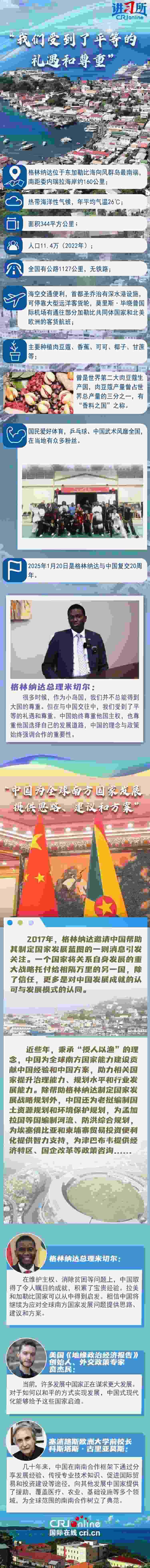 今年是格林納達與中國復交20周年。20年來,中格關(guān)系穩(wěn)定發(fā)展,雙方相互尊重、平等相待,政治互信不斷鞏固,各領(lǐng)域務(wù)實合作成果豐碩……樹立了大小國家平等相待、守望相助、互利共贏的典范。