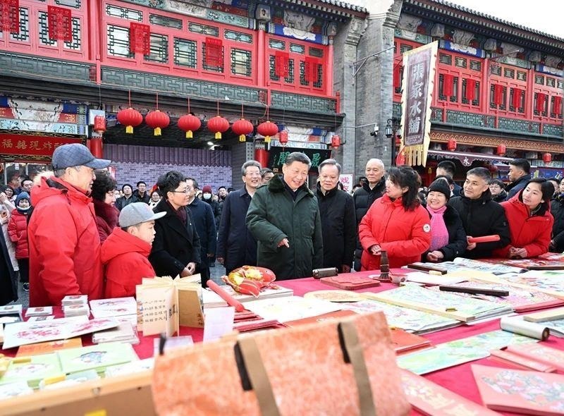 △2024年2月1日,習(xí)近平總書記在天津古文化街考察時(shí),同店鋪員工和現(xiàn)場群眾互動(dòng)交流。