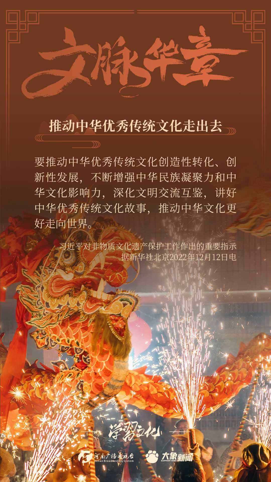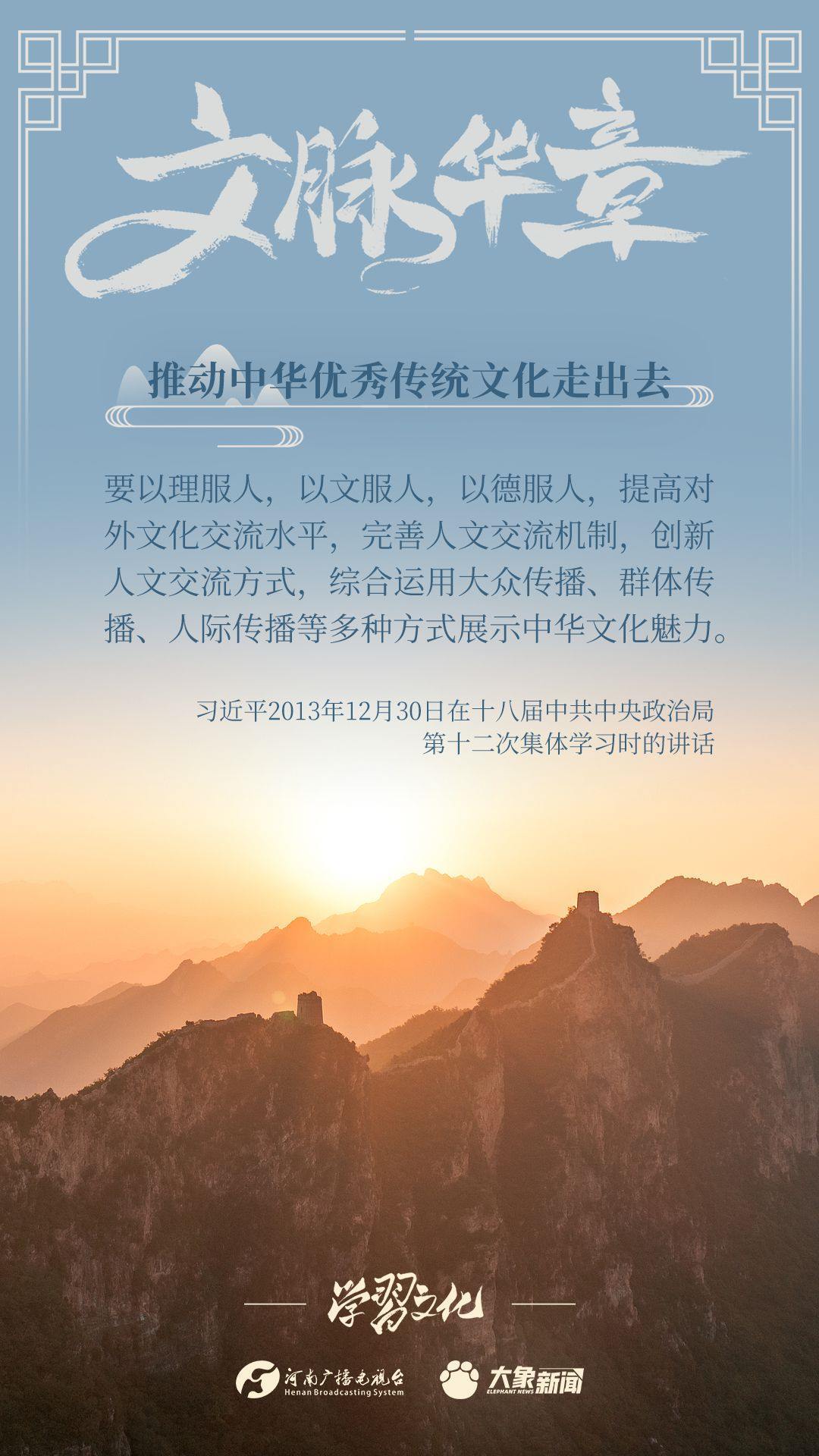 黨的十八大以來,習近平總書記高度重視中華優(yōu)秀傳統(tǒng)文化的傳承發(fā)展,突出強調(diào)推動中華優(yōu)秀傳統(tǒng)文化走出去,作出了一系列重要論述,大象新聞邀您一起學習。
