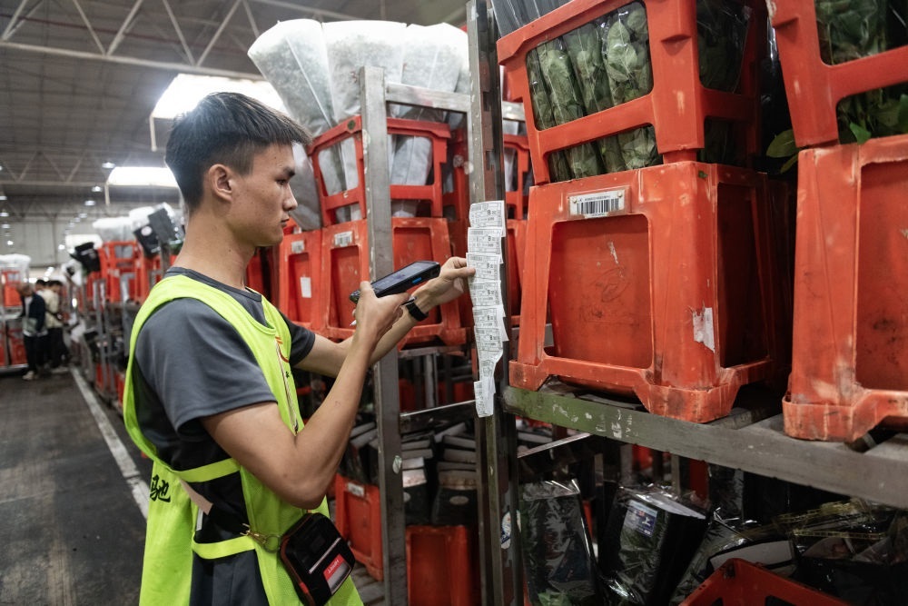 2023年7月13日,一名工作人員在昆明國際花卉拍賣交易中心內對臺車上存放的鮮花掃碼。