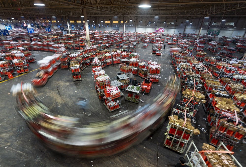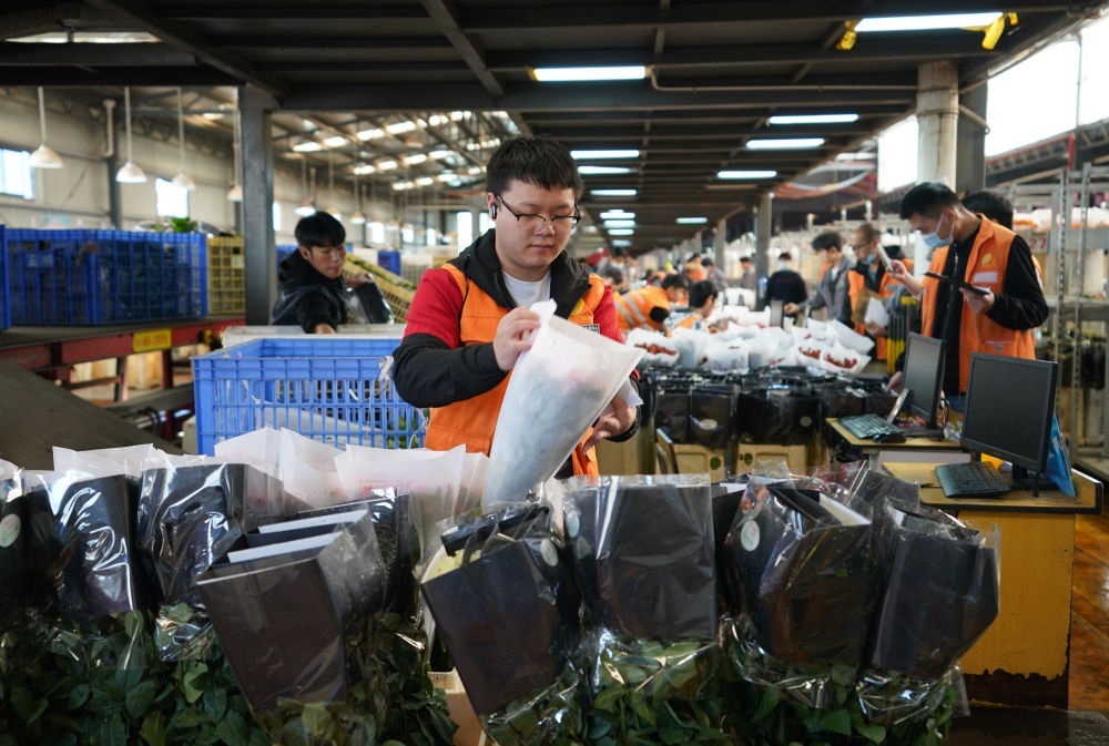 2022年11月11日,工作人員在昆明斗南花市給鮮花貼標簽。快遞物流時效不斷優(yōu)化、冷鏈運輸技術持續(xù)提升,也為中國鮮花加速“出?!北q{護航。