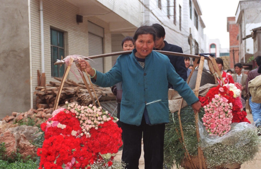 云南省昆明市呈貢龍街鄉(xiāng)斗南村是中國有名的“花鄉(xiāng)”,全村幾乎家家種花。這是一位當?shù)鼗ㄞr(nóng)挑著一擔鮮花去花卉交易市場出售(1999年6月2日發(fā))。