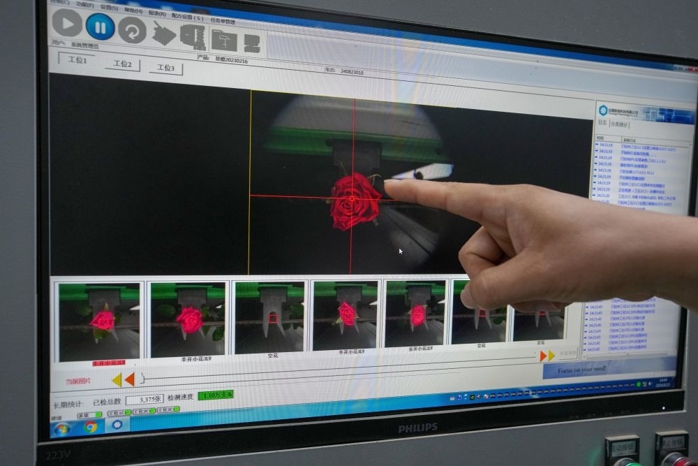 2024年8月23日,在云南晉寧花卉產(chǎn)業(yè)現(xiàn)代化示范園采后處理中心,計算機在實時監(jiān)測自動分揀流水線上的鮮切花。