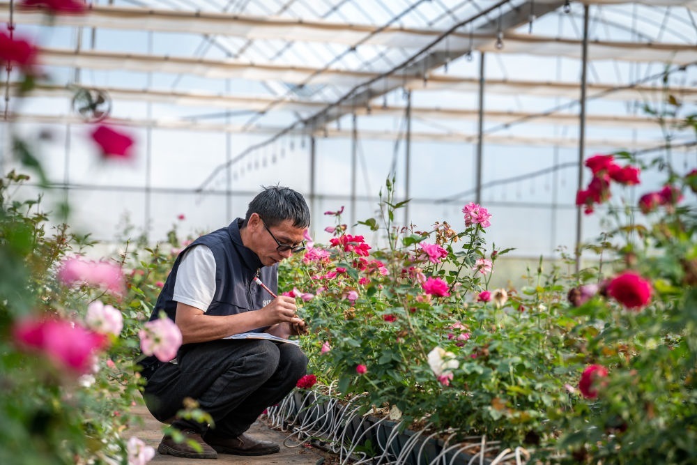 2023年10月20日,在云南省安寧市現(xiàn)代農(nóng)業(yè)園區(qū)玫瑰種植示范園,技術員田連通在記錄太空育種玫瑰花編號。