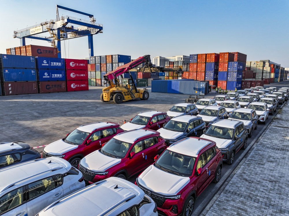 2024年10月28日在重慶國(guó)際物流樞紐園區(qū)西部陸海新通道重慶無(wú)水港拍攝的出口汽車(chē)裝運(yùn)現(xiàn)場(chǎng)(無(wú)人機(jī)照片)。位于重慶市沙坪壩區(qū)的重慶國(guó)際物流樞紐園區(qū),是重慶中歐班列、西部陸海新通道班列、渝滿(mǎn)俄班列、渝甬班列的主要到發(fā)點(diǎn),截至2024年10月,已開(kāi)通班列線(xiàn)路62條,輻射125個(gè)國(guó)家和地區(qū)的542個(gè)港口。