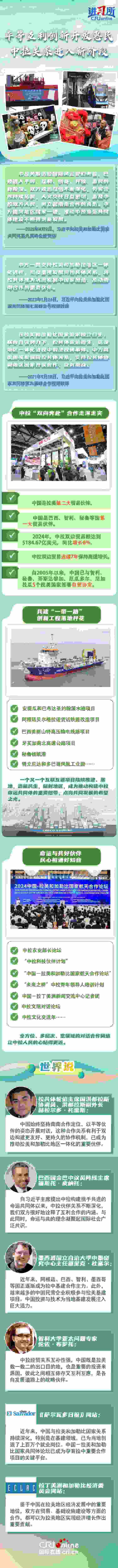 命運(yùn)與共,大道同行。2014年,習(xí)近平主席首次提出構(gòu)建中拉命運(yùn)共同體,為新時(shí)代中拉關(guān)系發(fā)展指明了方向,得到拉美和加勒比國家積極響應(yīng)。近年來,從就“引領(lǐng)中拉友好關(guān)系駛?cè)胄潞匠獭碧岢鼋ㄗh,到提出新時(shí)代中拉關(guān)系內(nèi)涵,習(xí)近平主席始終著眼于中國與拉美和加勒比國家命運(yùn)與共的未來,推動(dòng)中拉關(guān)系穩(wěn)步前進(jìn)。拉美地區(qū)媒體及政學(xué)界人士表示,中國始終堅(jiān)持南南合作定位,以中拉命運(yùn)共同體理念為指引,持續(xù)推動(dòng)雙邊關(guān)系升級(jí),已成為推動(dòng)拉美和加勒比地區(qū)一體化的重要伙伴。