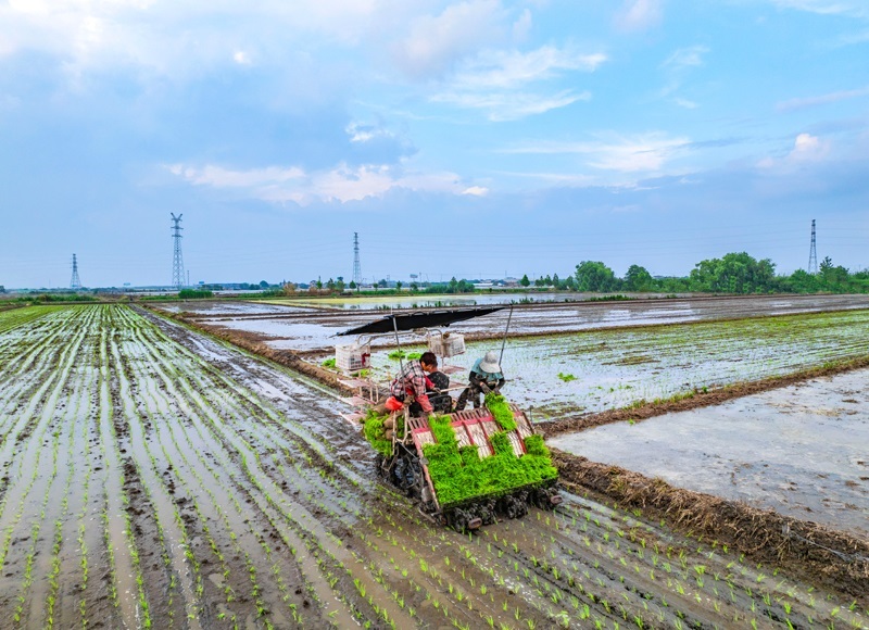 6月14日,在江蘇省興化市陳堡鎮(zhèn)蔣莊村,農(nóng)民在田間將剛起的秧苗裝車(無人機照片)。
