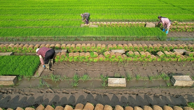 6月18日,在江蘇省海安市墩頭鎮(zhèn)千步村,農(nóng)民起水稻秧苗,準備進行水稻機插(無人機照片)。