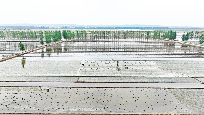 6月19日,山東省臨沂市郯城縣郯城街道農(nóng)民進行水稻插秧(無人機照片)。